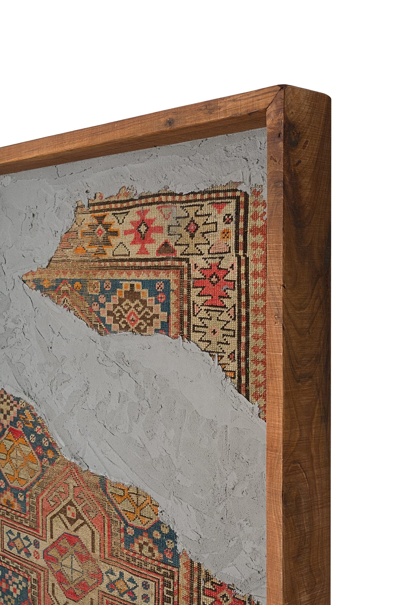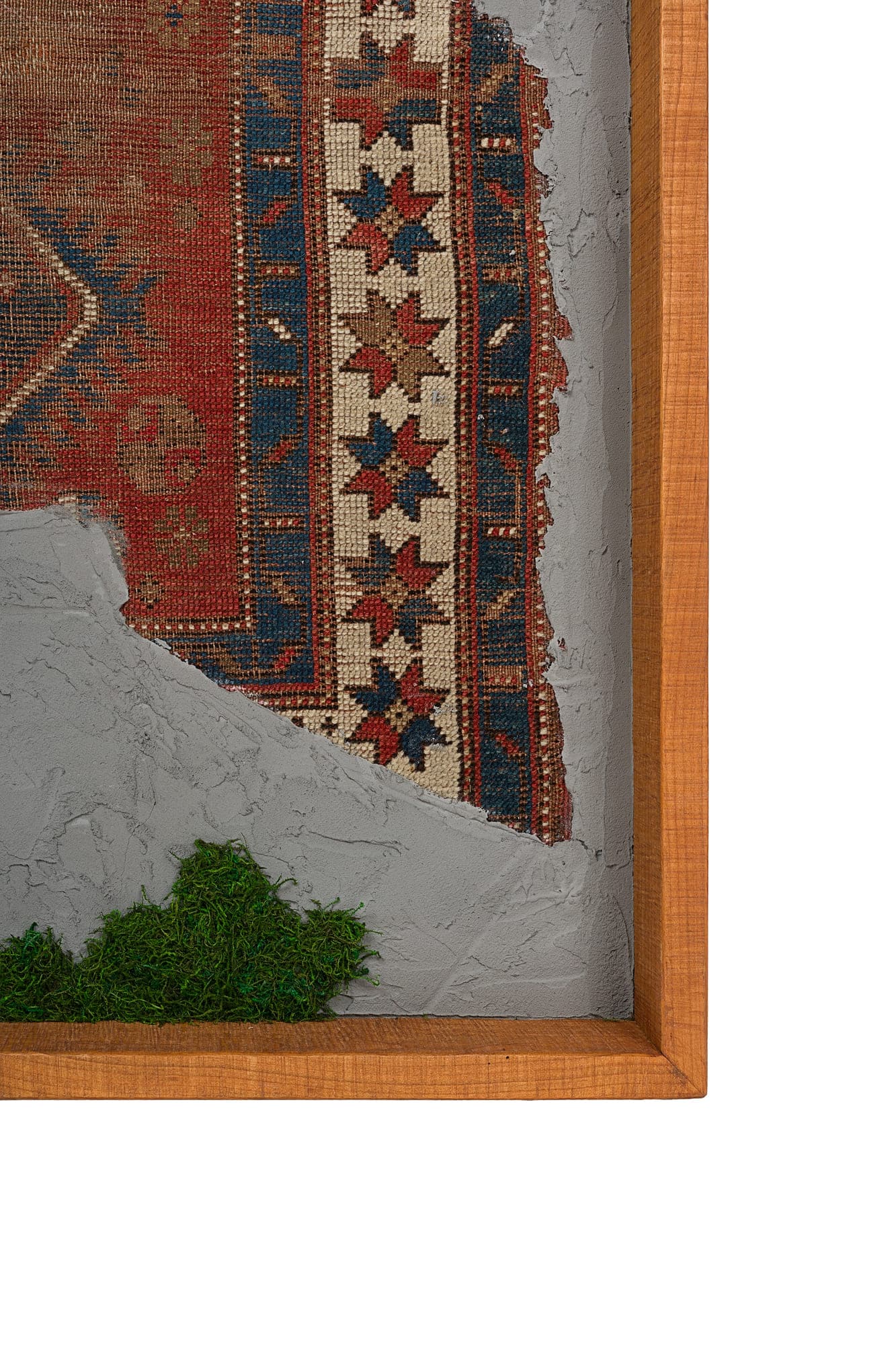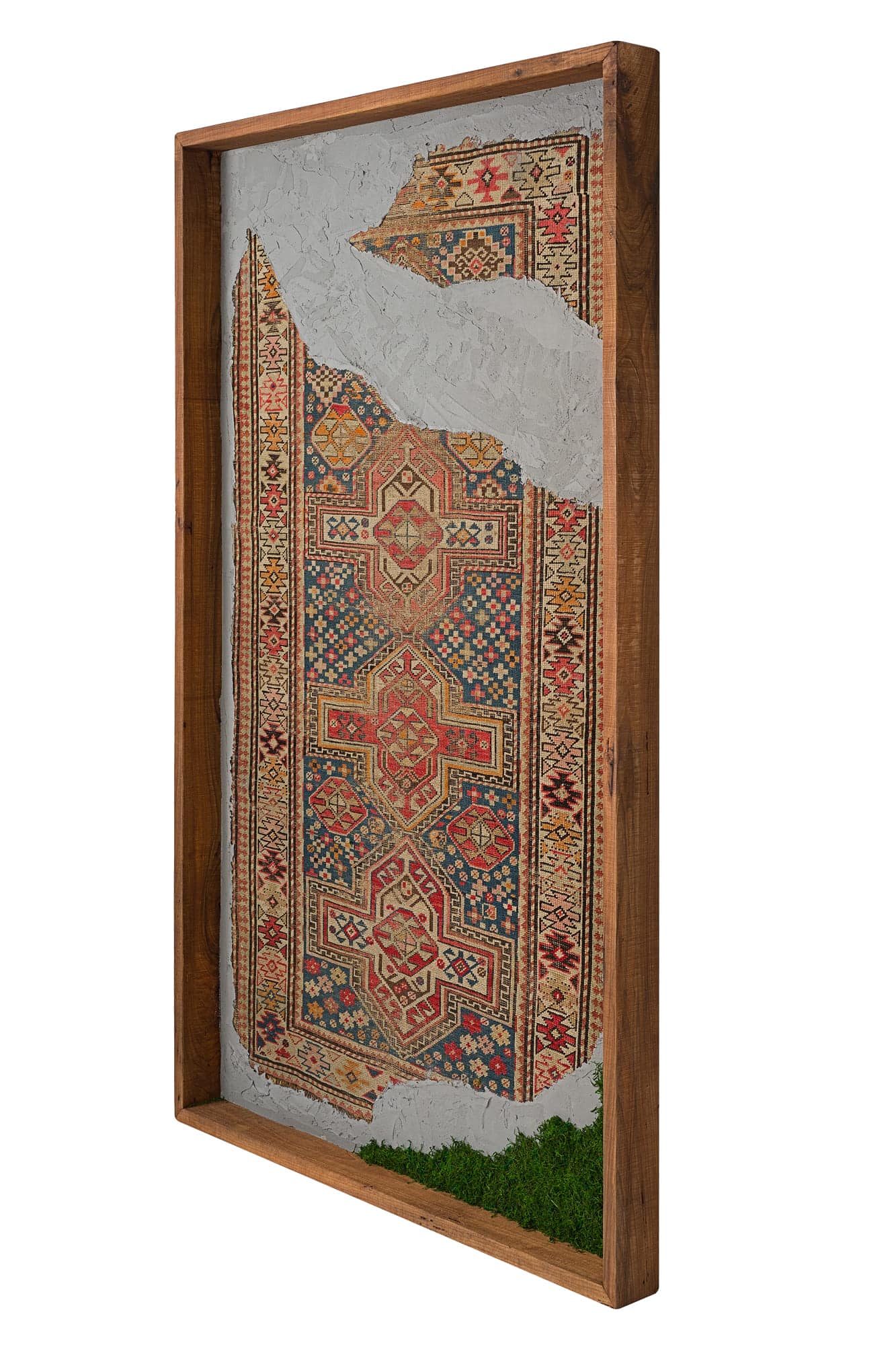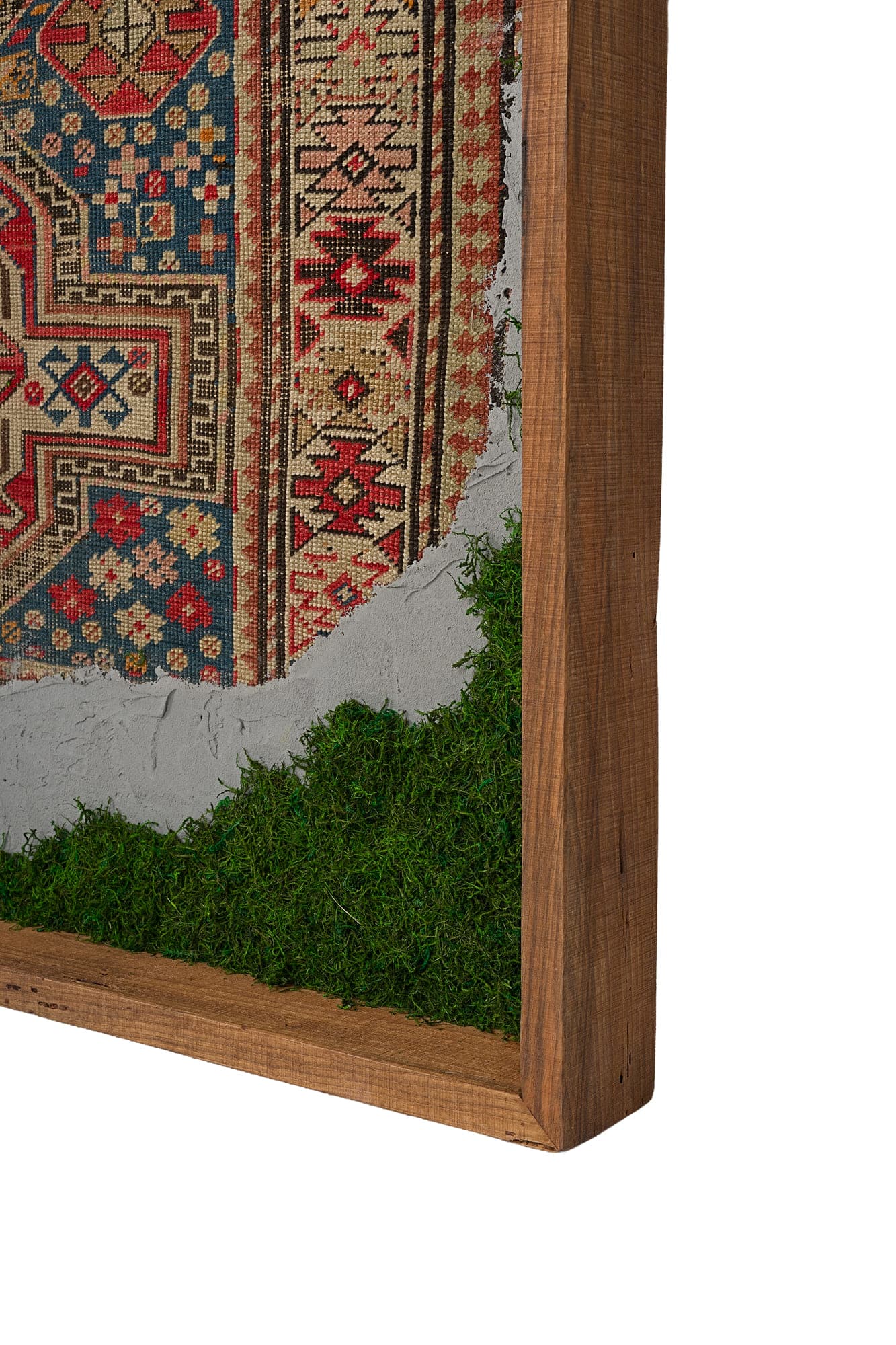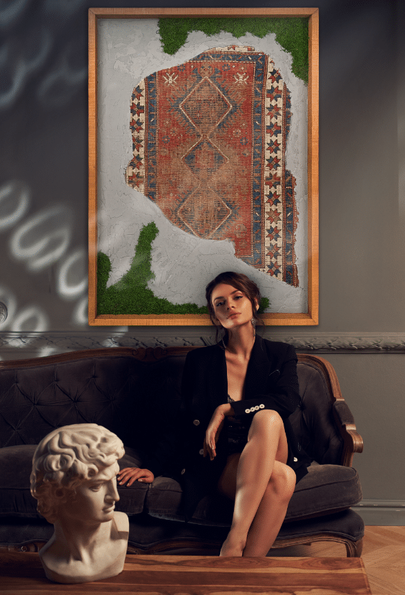 Questa collezione di quadri presenta esclusivamente pezzi unici. Ogni quadro è realizzato in un mix di materiali di cui i frammenti di tappeti antichi caucasici e anatolici sono protagonisti. L’ispirazione è l’unione di arte tessile e arte muraria, dove frammenti di tappeti antichi si uniscono a scorci di cemento materico e Muschio Piatto stabilizzato. Carpet Frame è una collezione che evoca l’antichità, gli affreschi e gli arazzi antichi. Ogni quadro può essere personalizzato con due forme di cornice, piatta o a taglio vivo sporgente. Le cornici possono essere scelte in legno crudo o con finiture ad olio. Sono disponibili legni di Castagno antichi, Ciliegio antico, Rovere antico, Olmo antico.
