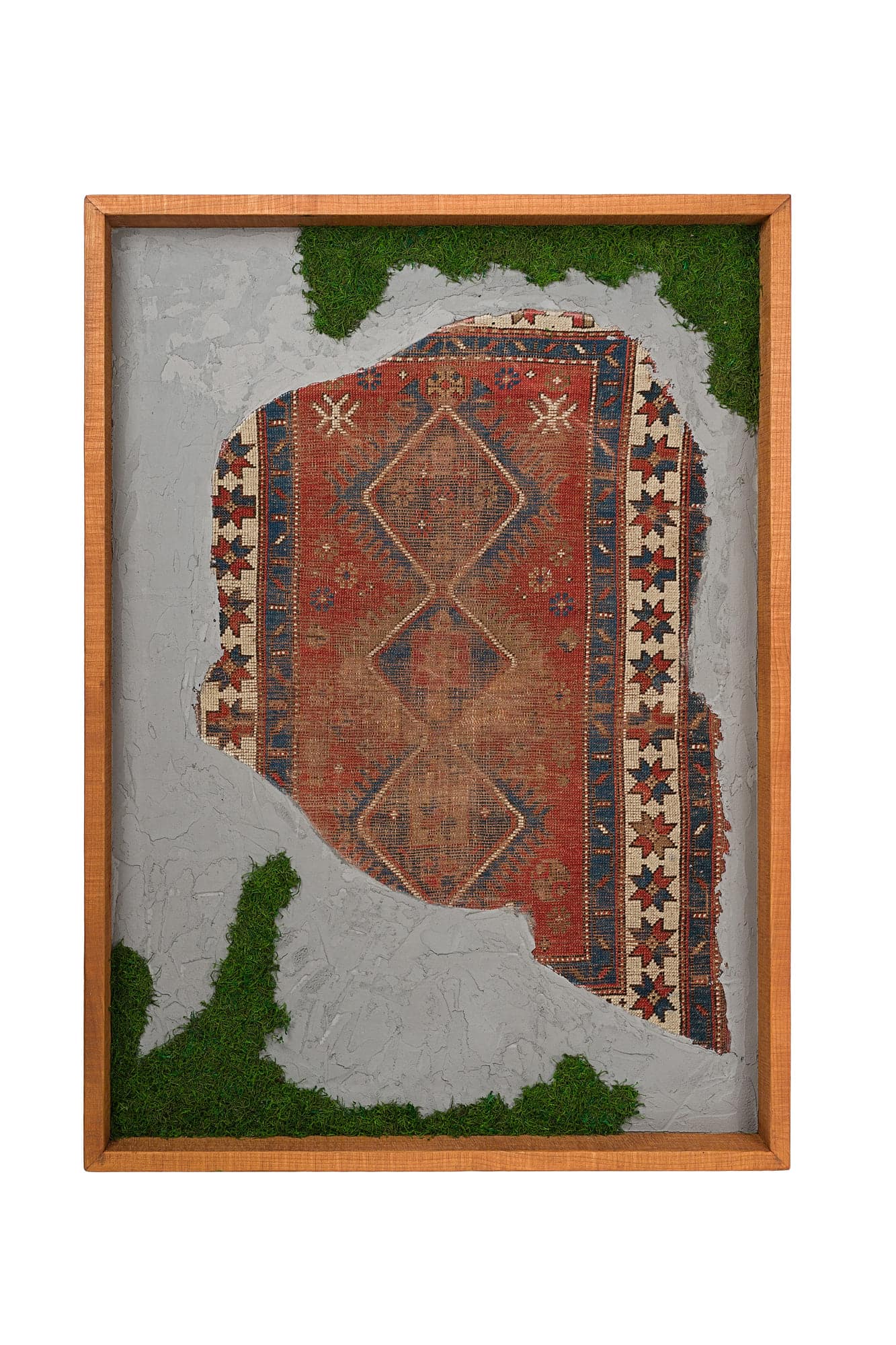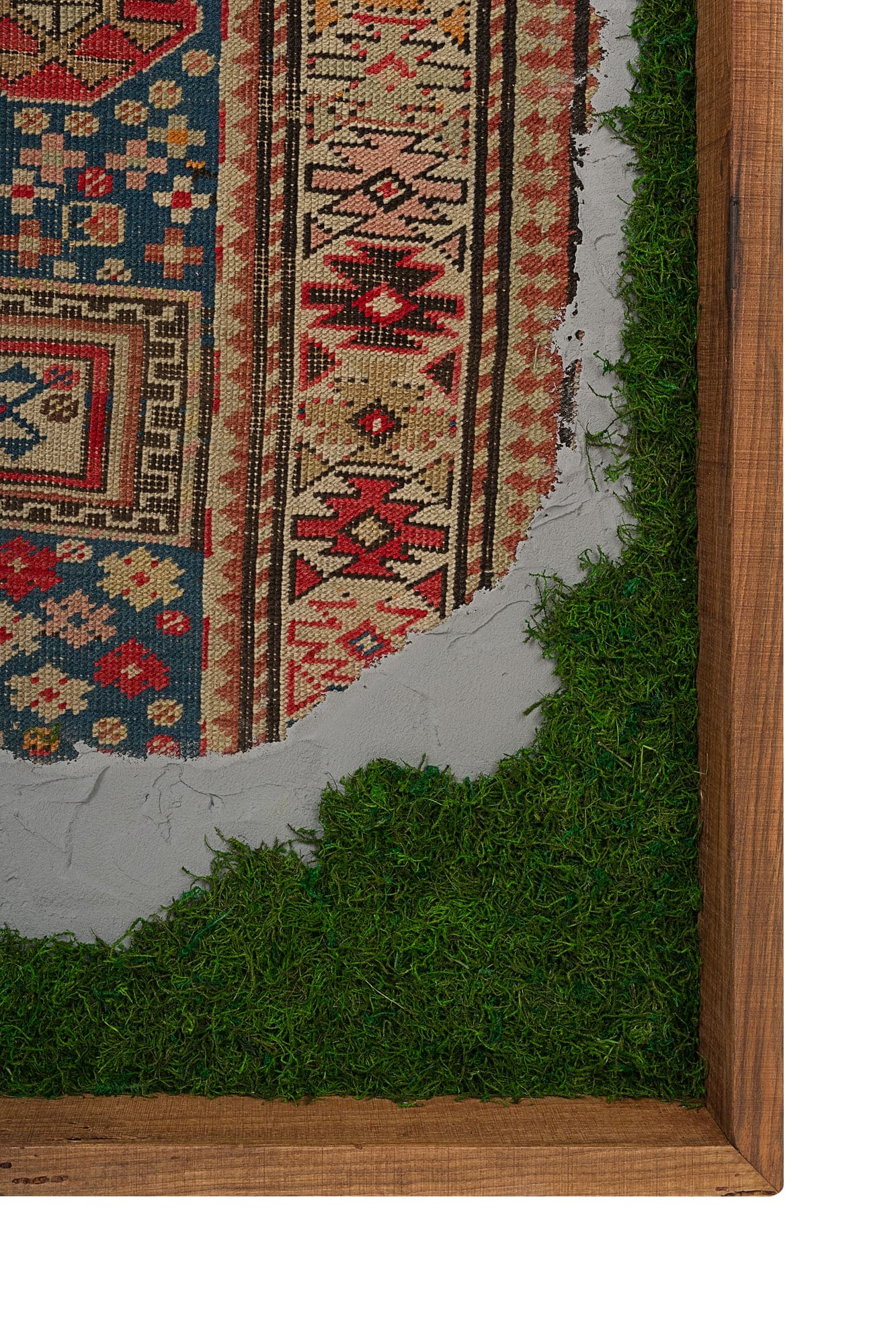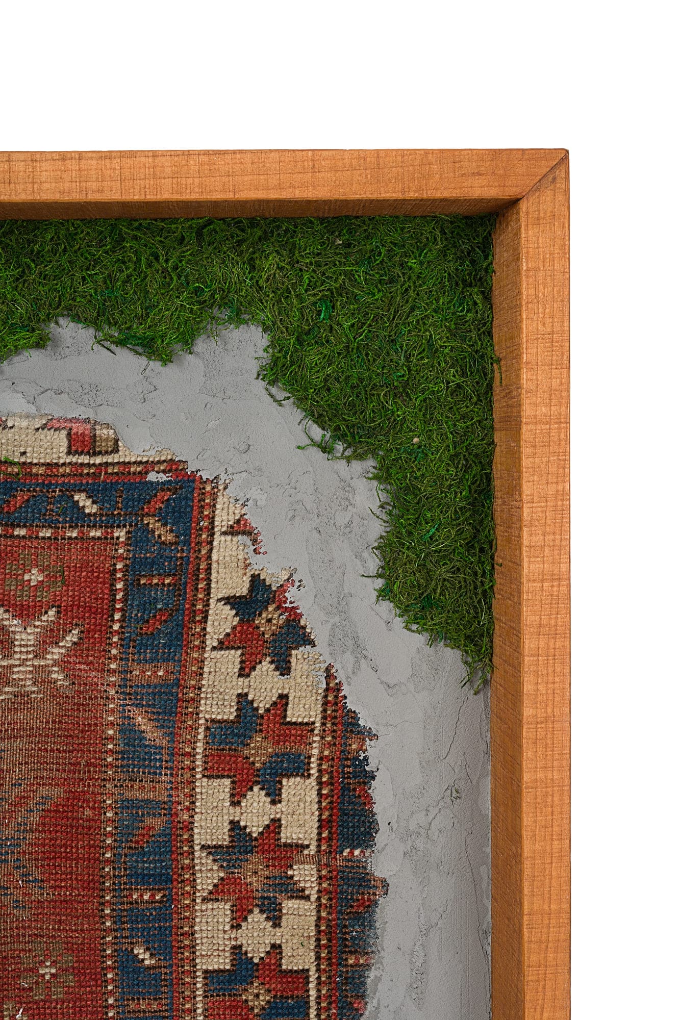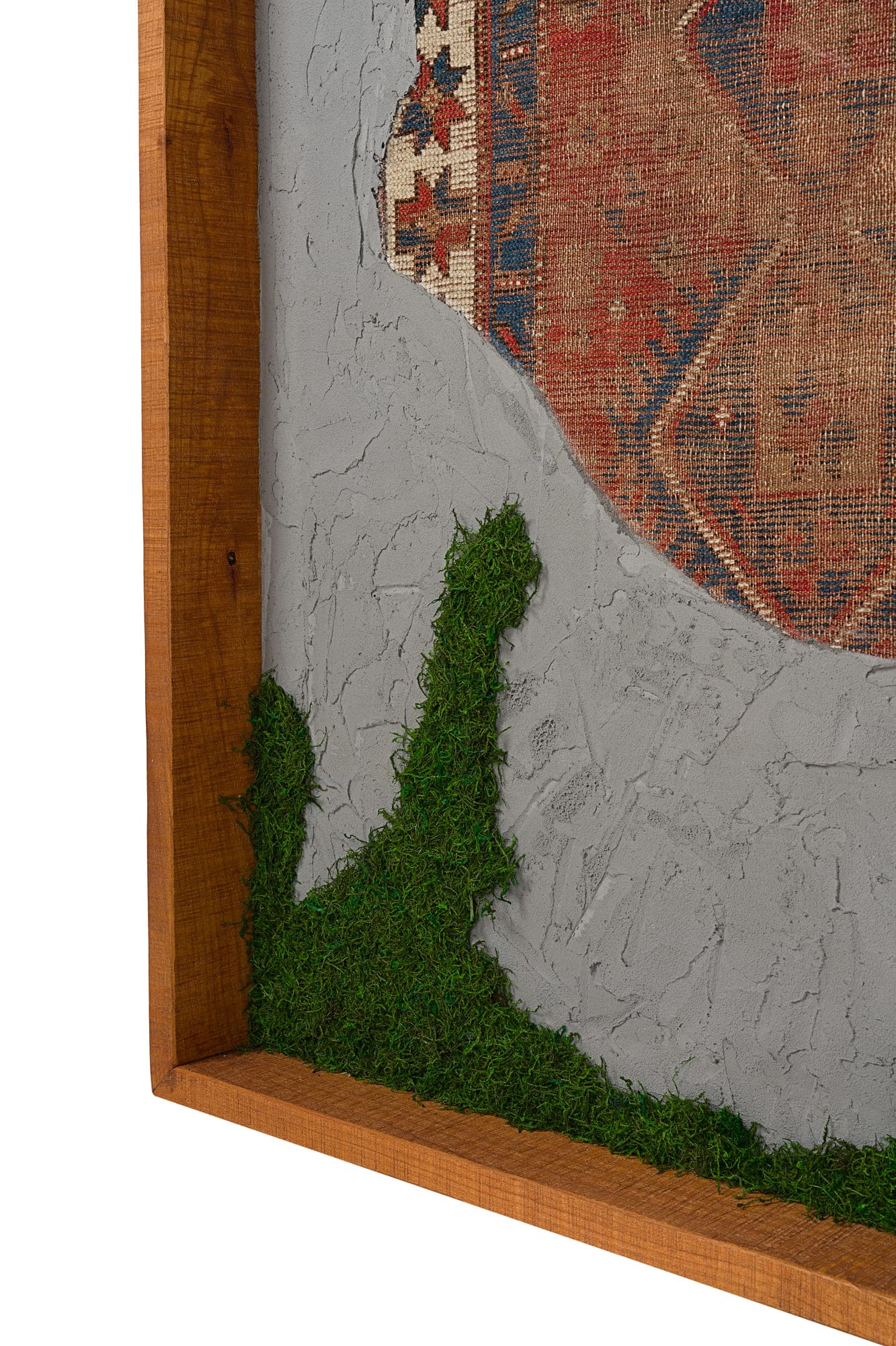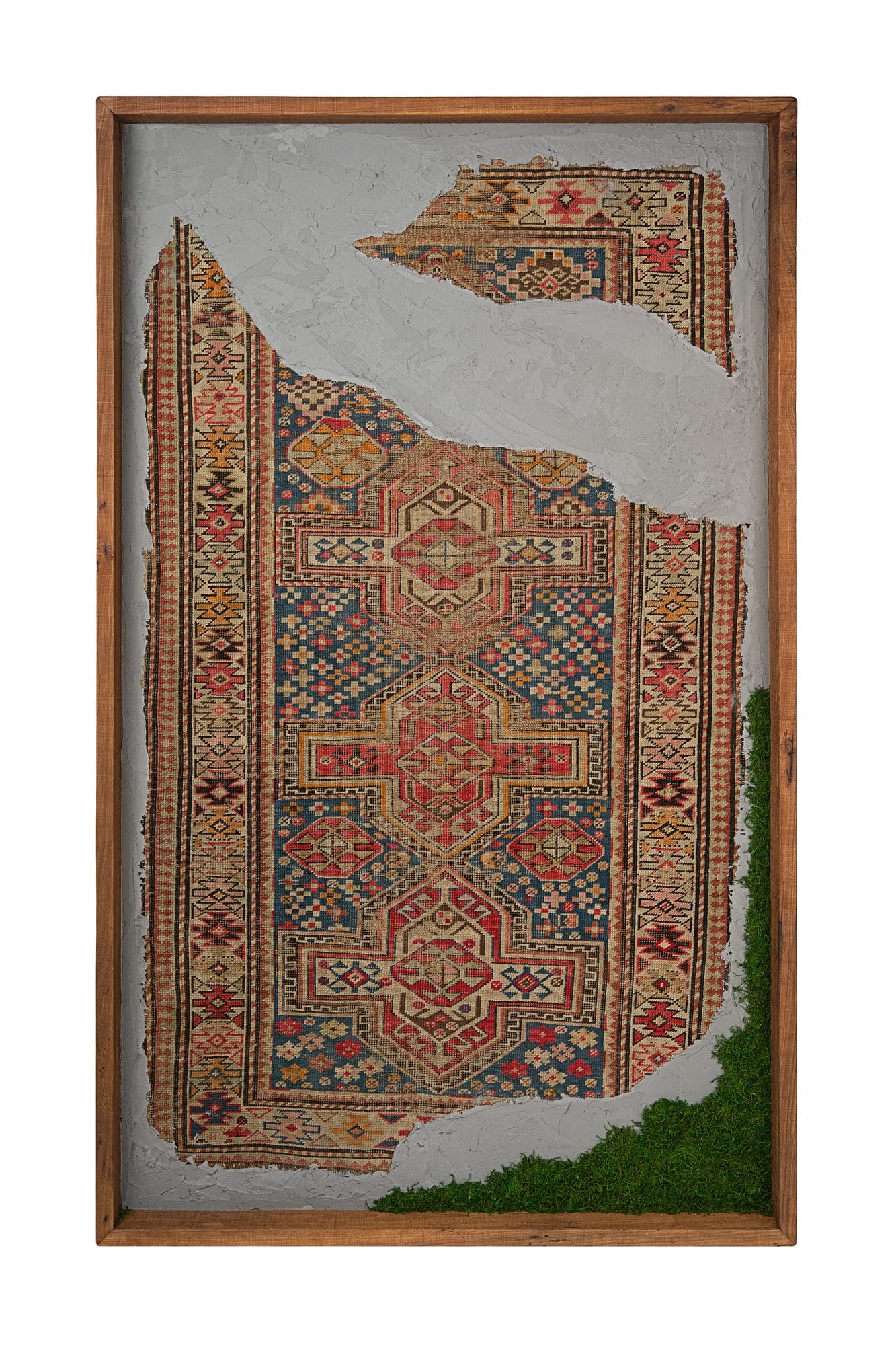 Questa collezione di quadri presenta esclusivamente pezzi unici. Ogni quadro è realizzato in un mix di materiali di cui i frammenti di tappeti antichi caucasici e anatolici sono protagonisti. L’ispirazione è l’unione di arte tessile e arte muraria, dove frammenti di tappeti antichi si uniscono a scorci di cemento materico e Muschio Piatto stabilizzato. Carpet Frame è una collezione che evoca l’antichità, gli affreschi e gli arazzi antichi. Ogni quadro può essere personalizzato con due forme di cornice, piatta o a taglio vivo sporgente. Le cornici possono essere scelte in legno crudo o con finiture ad olio. Sono disponibili legni di Castagno antichi, Ciliegio antico, Rovere antico, Olmo antico.