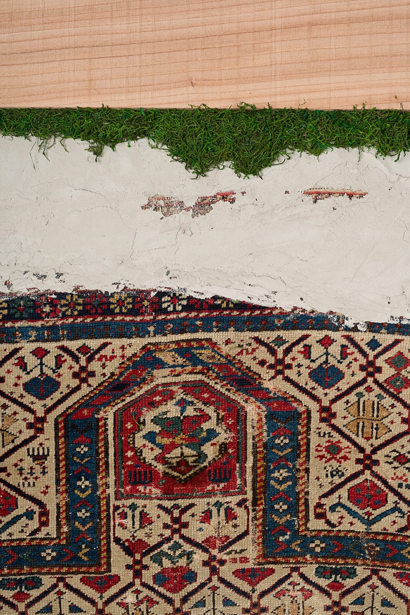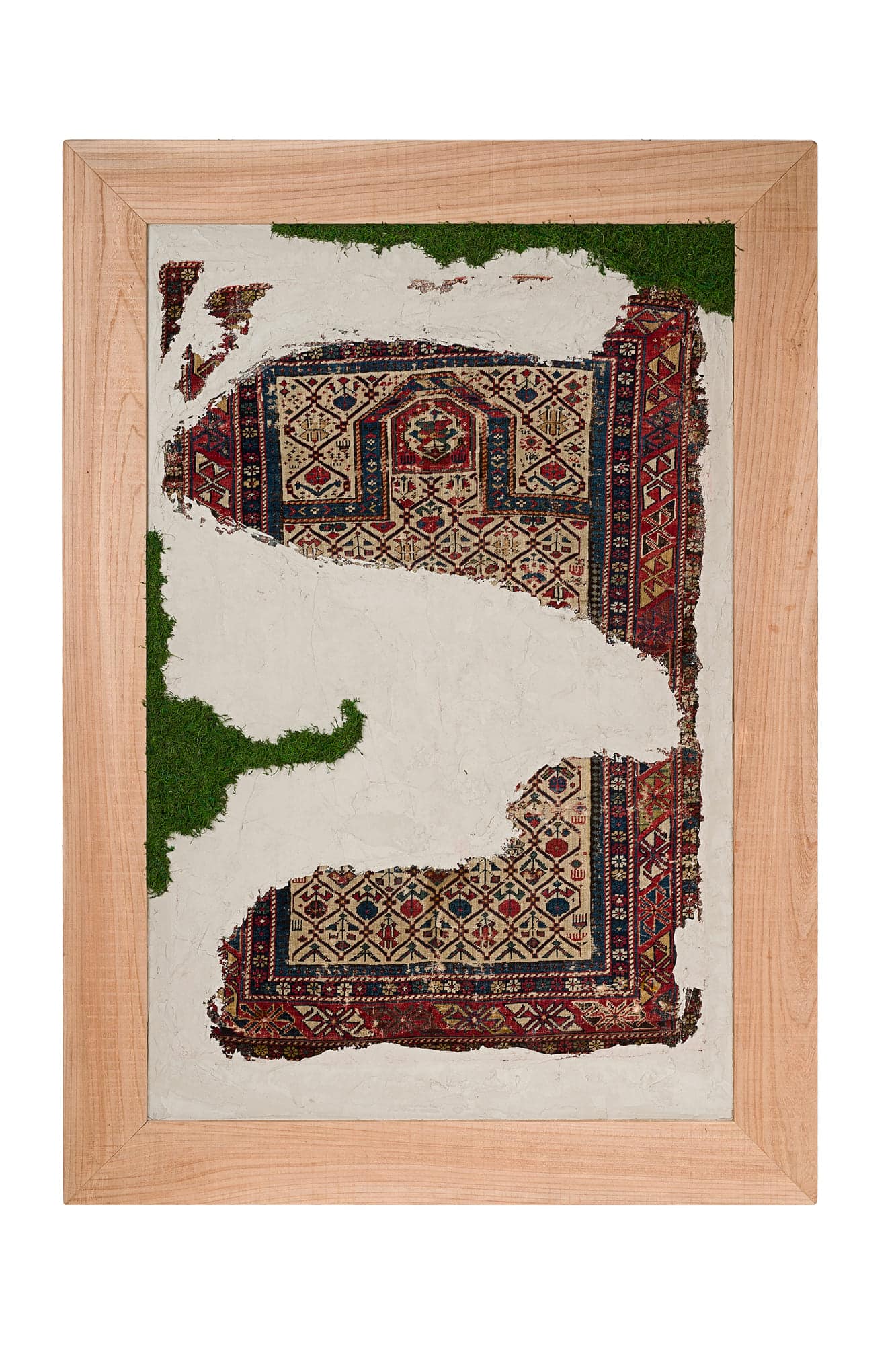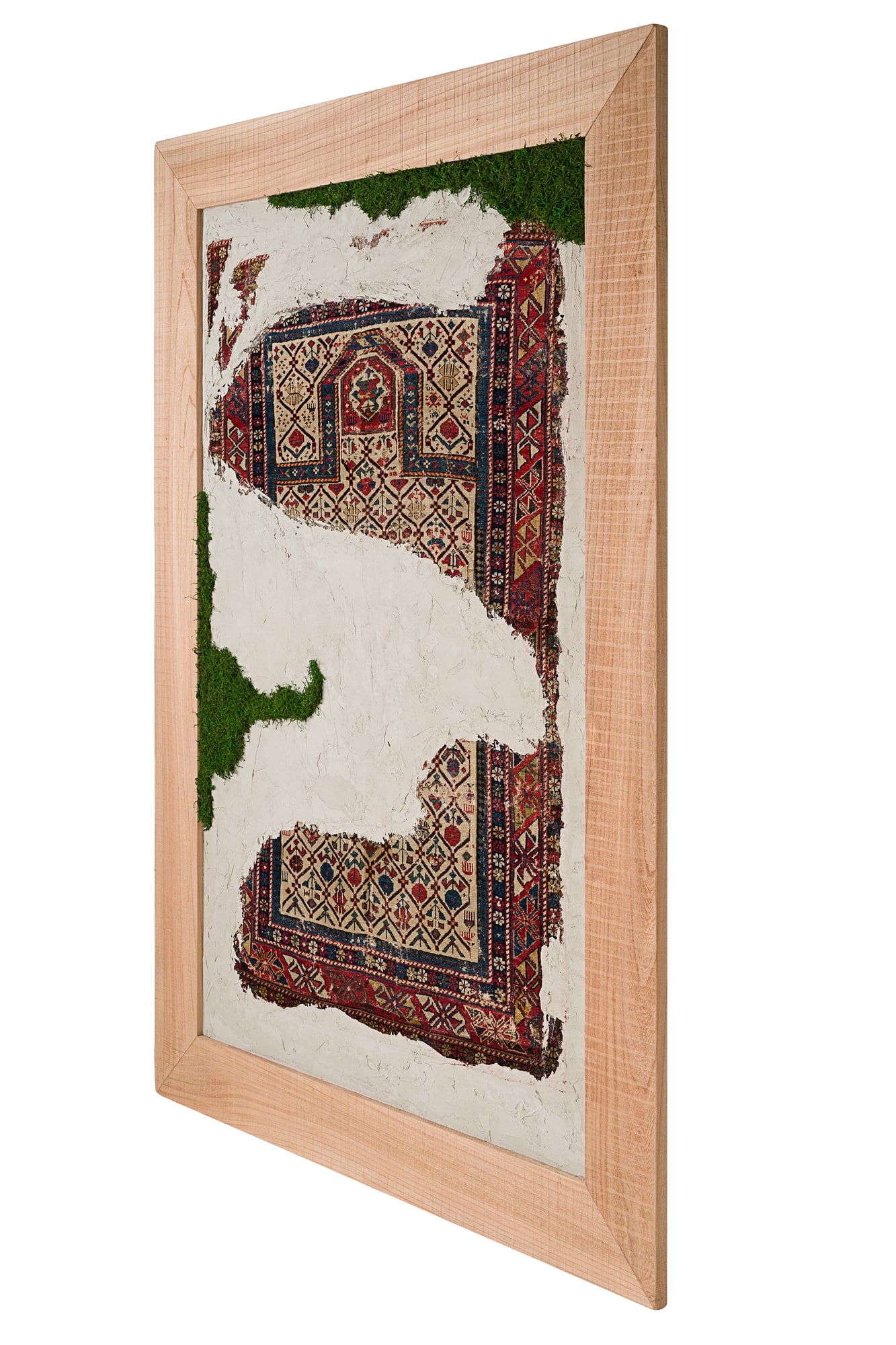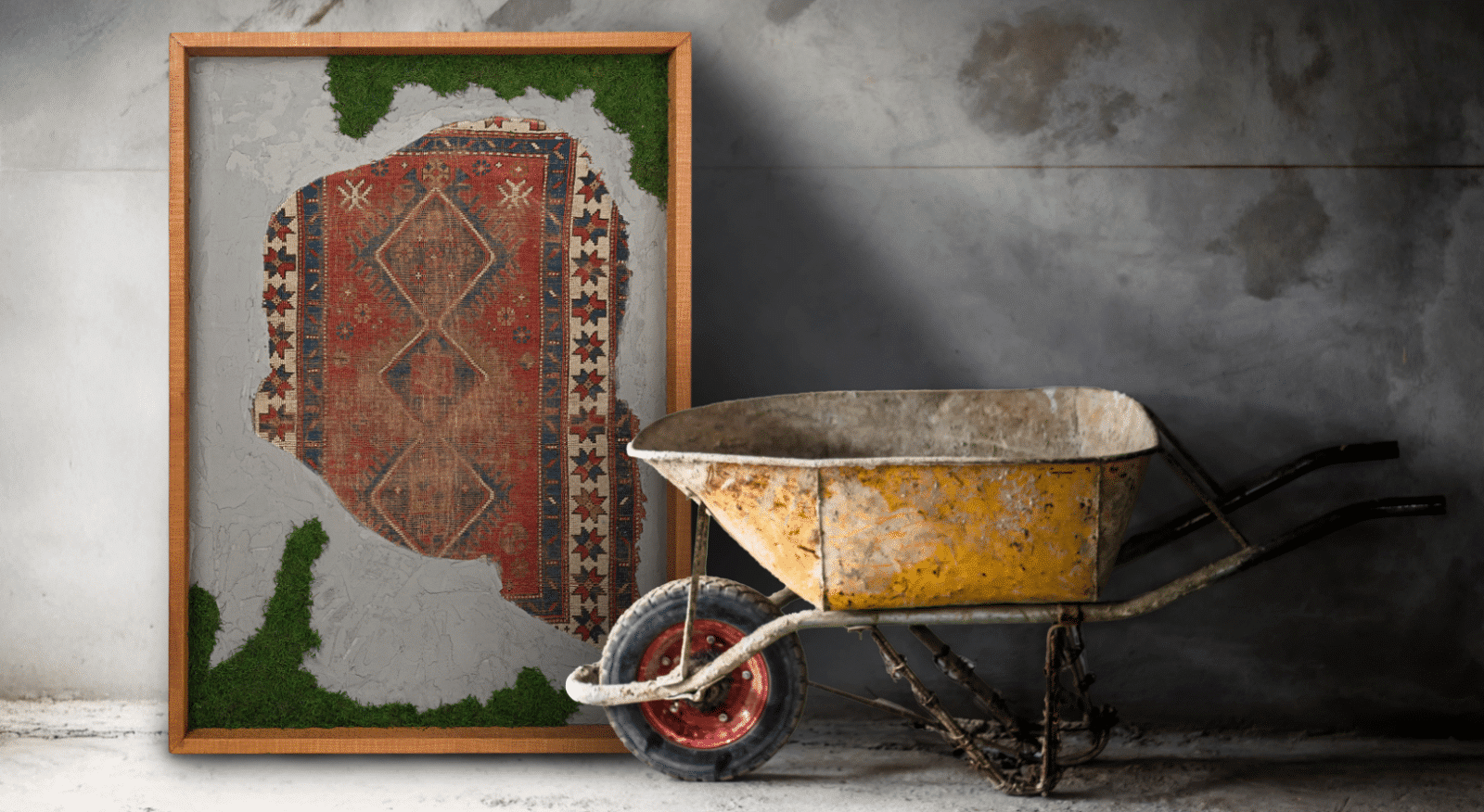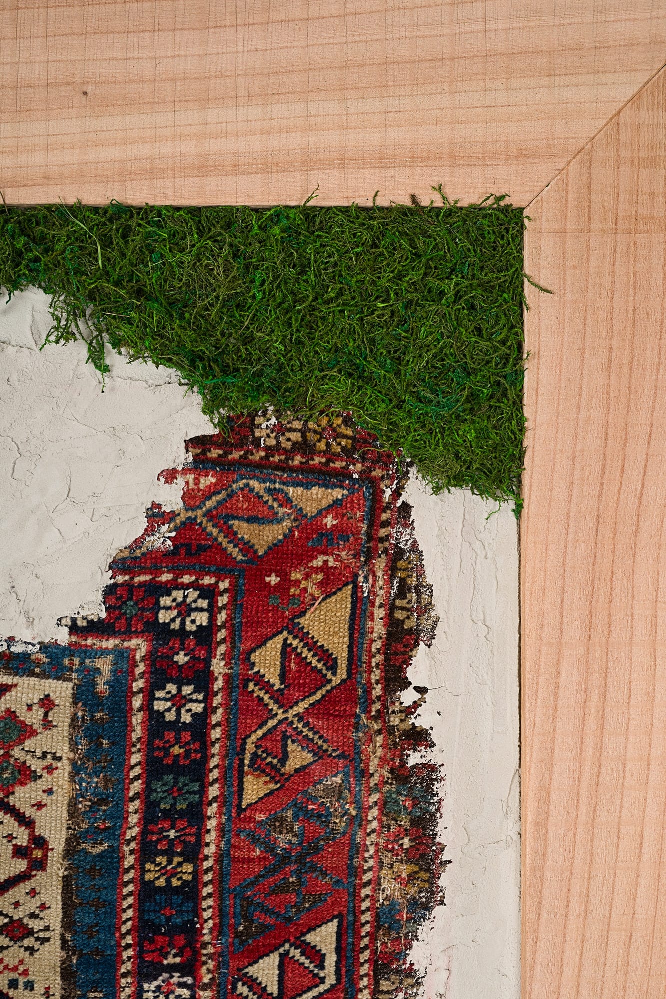 Questa collezione di quadri presenta esclusivamente pezzi unici. Ogni quadro è realizzato in un mix di materiali di cui i frammenti di tappeti antichi caucasici e anatolici sono protagonisti. L’ispirazione è l’unione di arte tessile e arte muraria, dove frammenti di tappeti antichi si uniscono a scorci di cemento materico e Muschio Piatto stabilizzato. Carpet Frame è una collezione che evoca l’antichità, gli affreschi e gli arazzi antichi. Ogni quadro può essere personalizzato con due forme di cornice, piatta o a taglio vivo sporgente. Le cornici possono essere scelte in legno crudo o con finiture ad olio. Sono disponibili legni di Castagno antichi, Ciliegio antico, Rovere antico, Olmo antico.