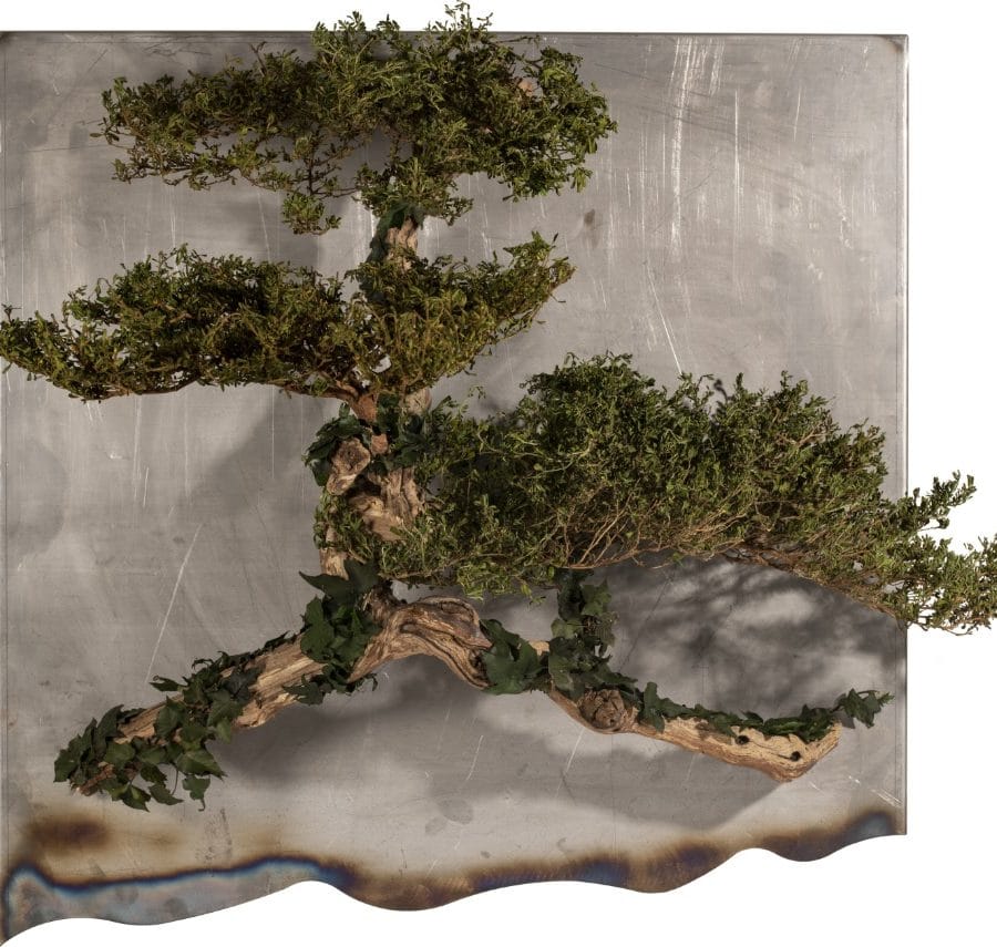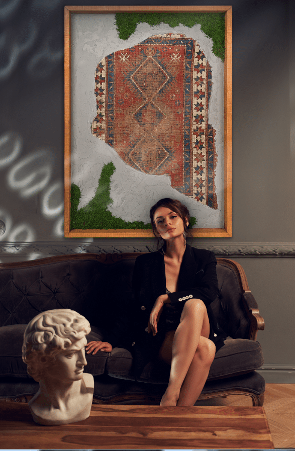 This collection of frameworks features exclusively unique pieces. Each Carpet Frame is made from a mix of materials, with fragments of antique Caucasian and Anatolian carpets playing a leading role. The inspiration is the union of textile art and wall art, where fragments of antique carpets are combined with glimpses of textured concrete and stabilised flat moss. Carpet Frame is a collection that evokes antiquity, frescoes and antique tapestries. Each picture can be customised with two frame shapes, flat or protruding raw-cut. The frames can be chosen in raw wood or with oil finishes. Antique chestnut, antique cherry, antique oak and antique elm woods are available.