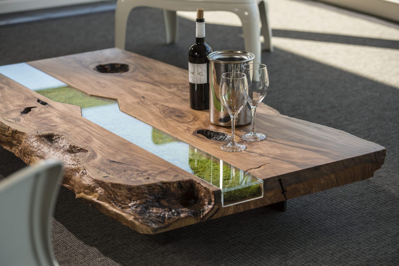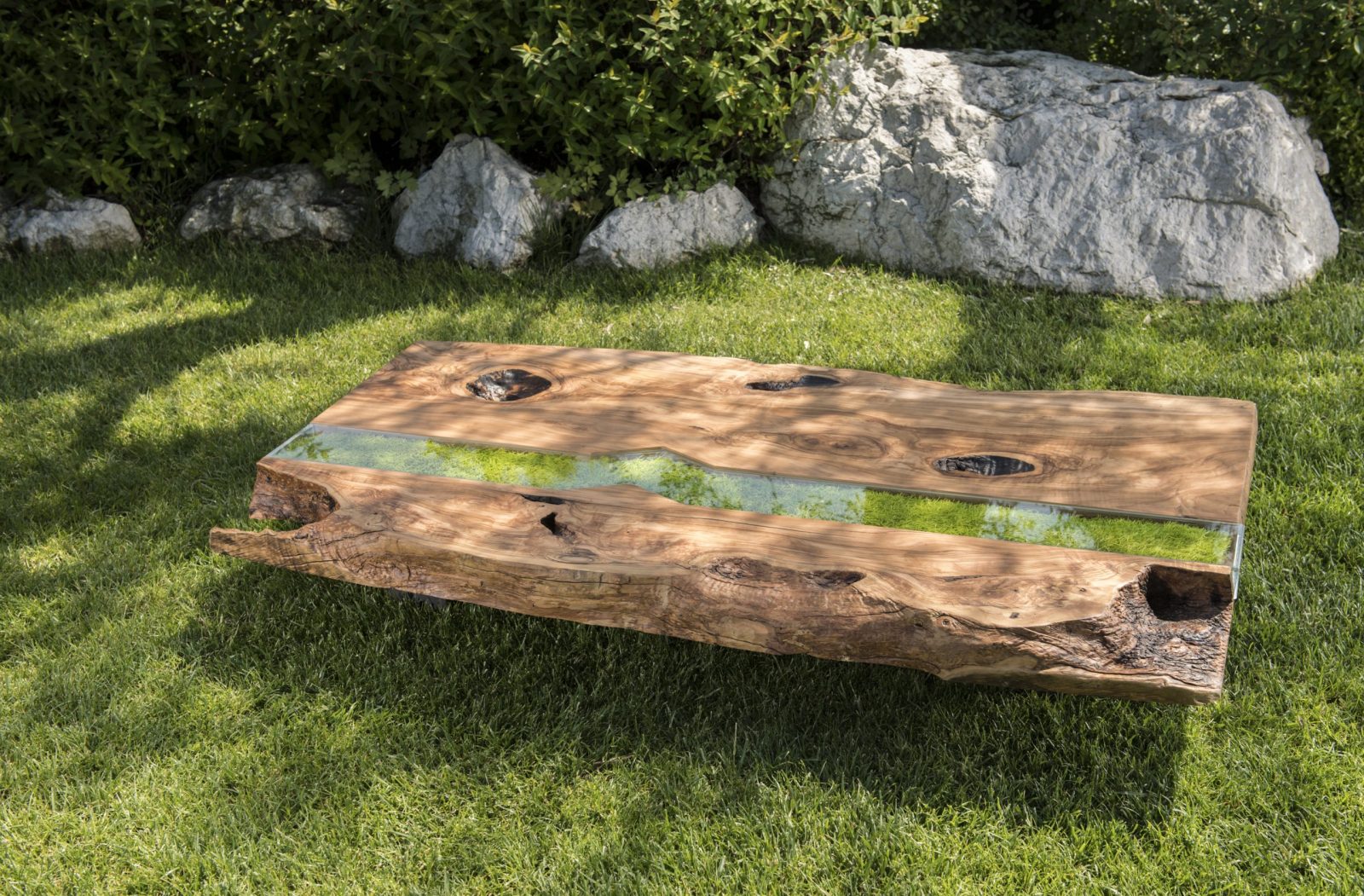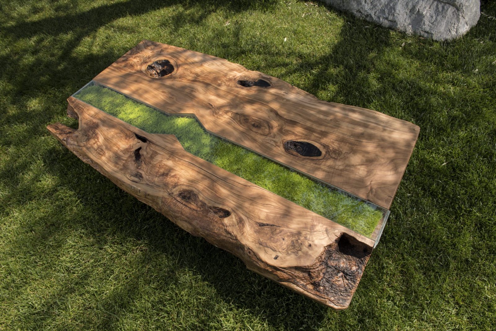 The preserved meadow and Lichen are available in different colours and they are set in between the wood structure. A tempered glass cover is placed on top.