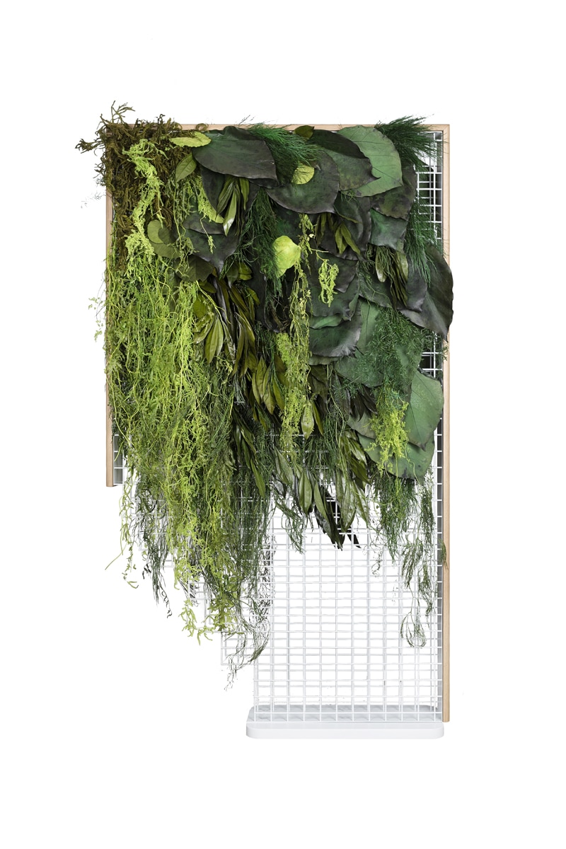 Our self-supporting Tropical Partition, available either in white or charcoal grey colours, is an evocative board withholding charismatic Tropical-like arrangements. The preserved greenery interwoven along the sides and through the metal mesh-based structure, is not only useful to separate contract spaces, but also helps create a see-through effect as if one was looking through lush forest foliage.