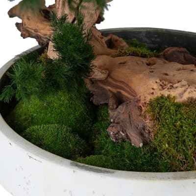 Stabilized bonsai and landscape in cement vase. Asparagus Ming bonsai has bright green needle-like foliage and a beautiful knobby trunk. The landscape below is made with preserved ball moss and flat moss.